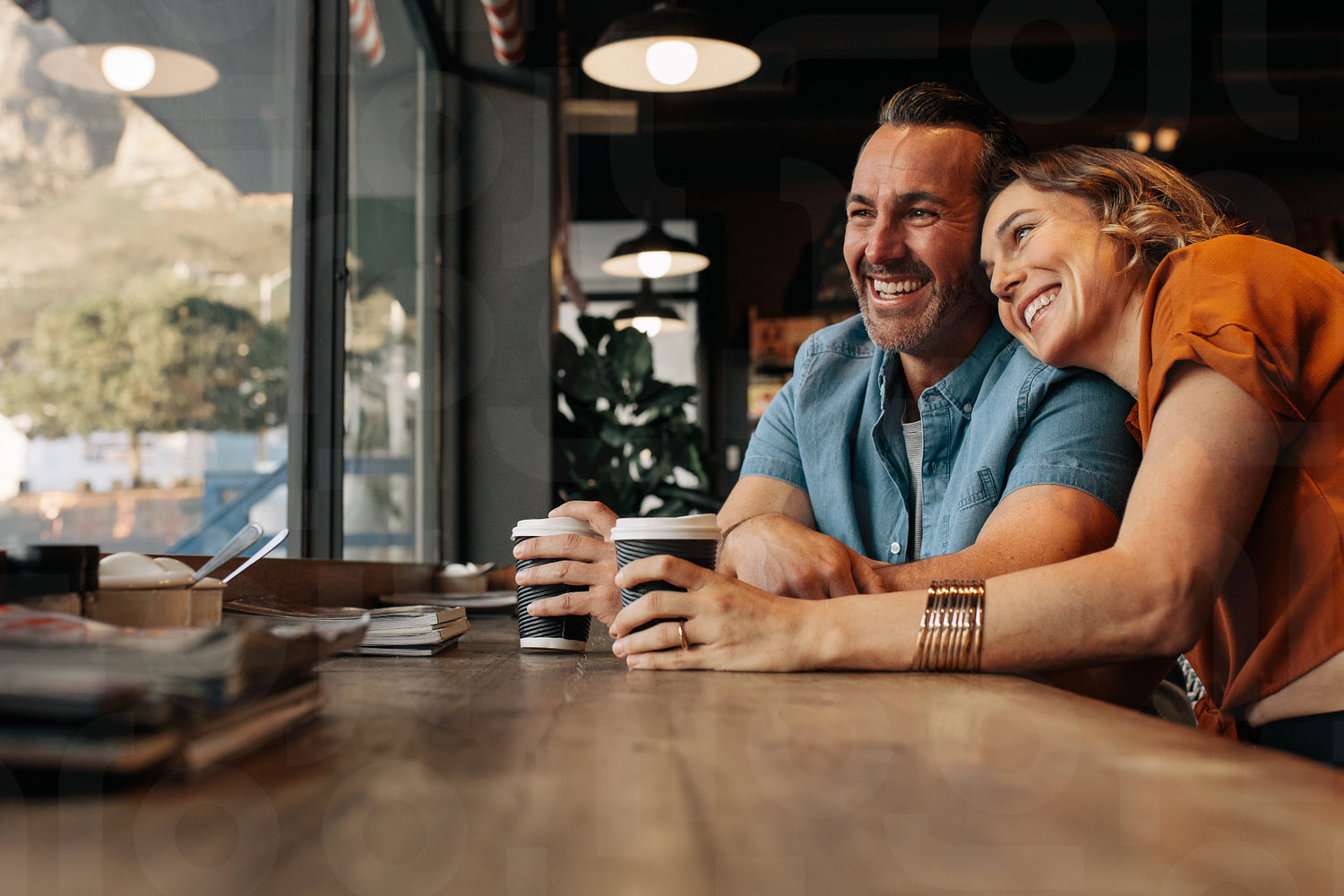 Happy couple relaxing at cafe with a cup of coffee. Smiling man and woman sitting at coffee shop and looking outside the window together.