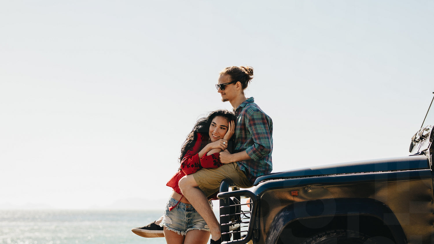 Young man and woman on road trip relaxing by their car at the beach. Affectionate young couple at the beach besides their car.