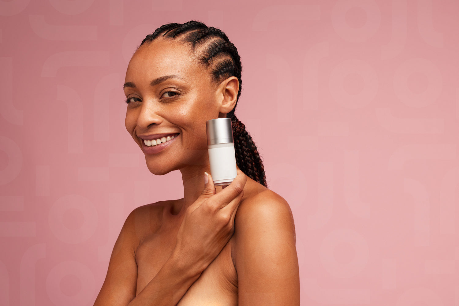 Portrait of a beautiful female model showing skincare product. Woman displaying a beauty product for to make your skin healthy.