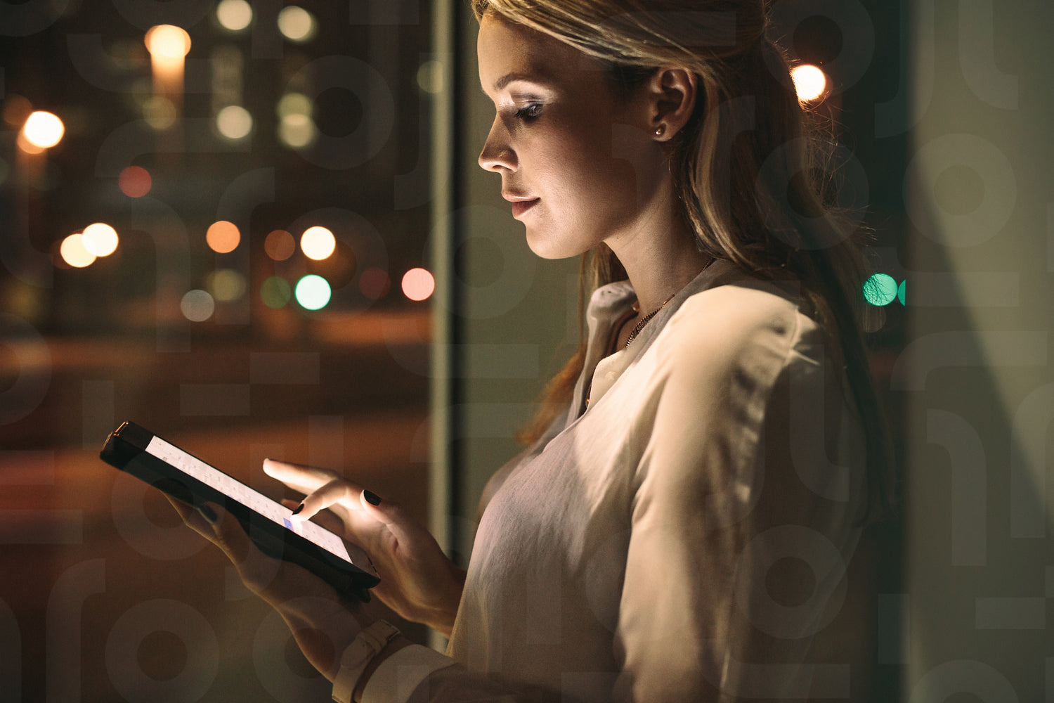 Close up of young businesswoman working on digital tablet in office. Beautiful female working late night in office.