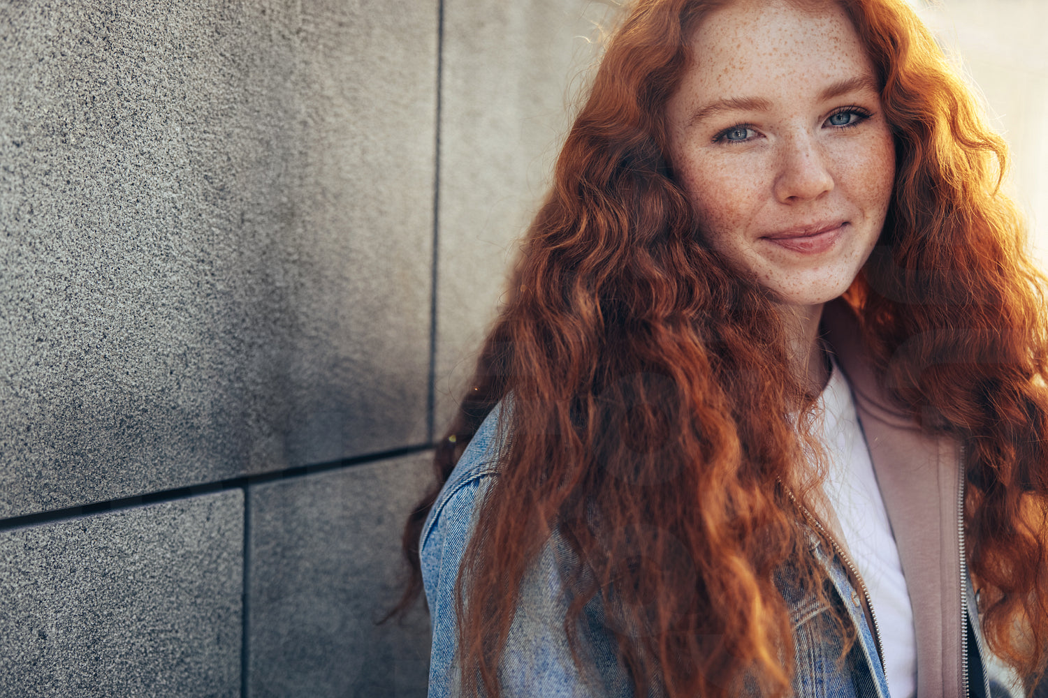 Beautiful girl smiling at camera outdoors in university. Young woman in college campus.