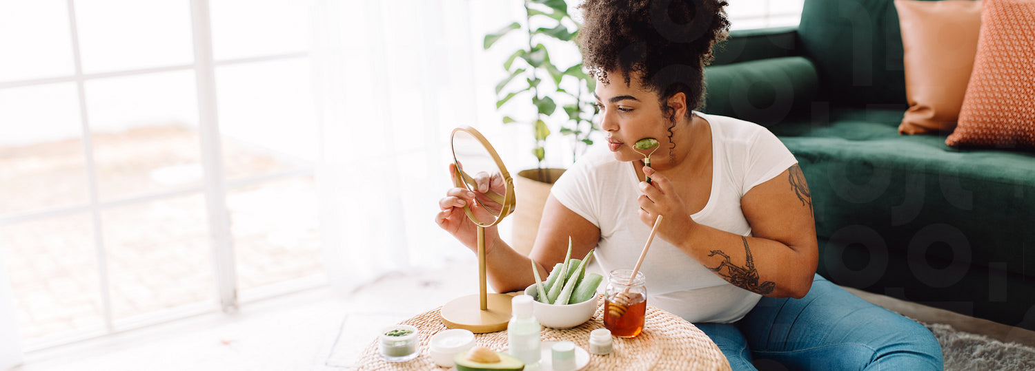 Beautiful healthy woman sitting in living room doing skin care routine at home. Female massaging face using massage tools at home.