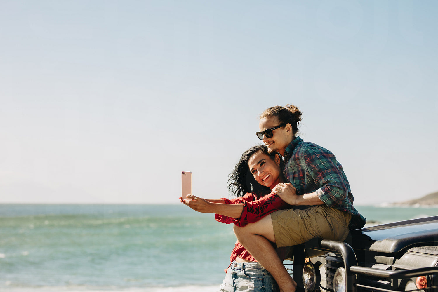 Loving young couple taking a selfie while on a roadtrip together. Man and woman standing by their car at beach and taking a selfie.