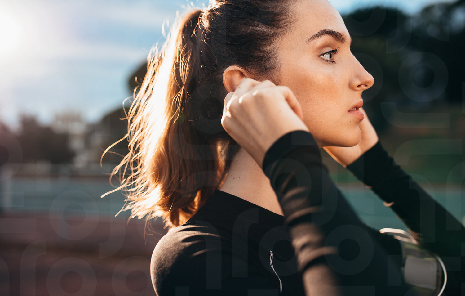 Close up shot of beautiful young woman with earphones. Face of sportswoman adjusting earphones to listen music during outdoor workout.