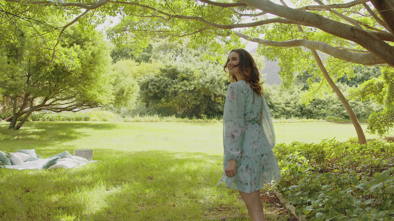 Beautiful woman in floral dress walking in the garden. Woman enjoying a weekend in the park.