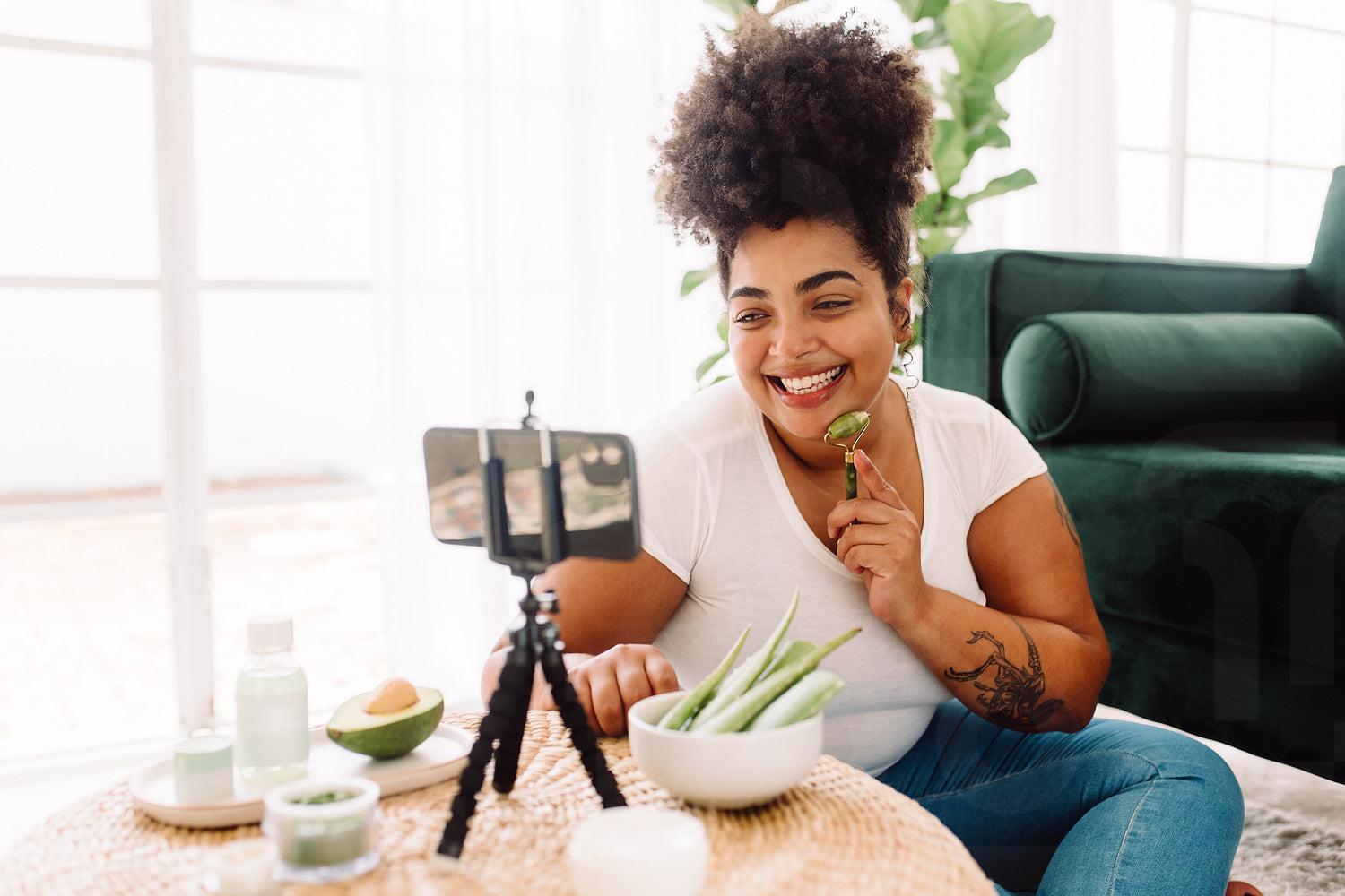 Beautiful woman in living room recording her self while doing skin care routine. Pretty female doing face care and taking video for her online channel.
