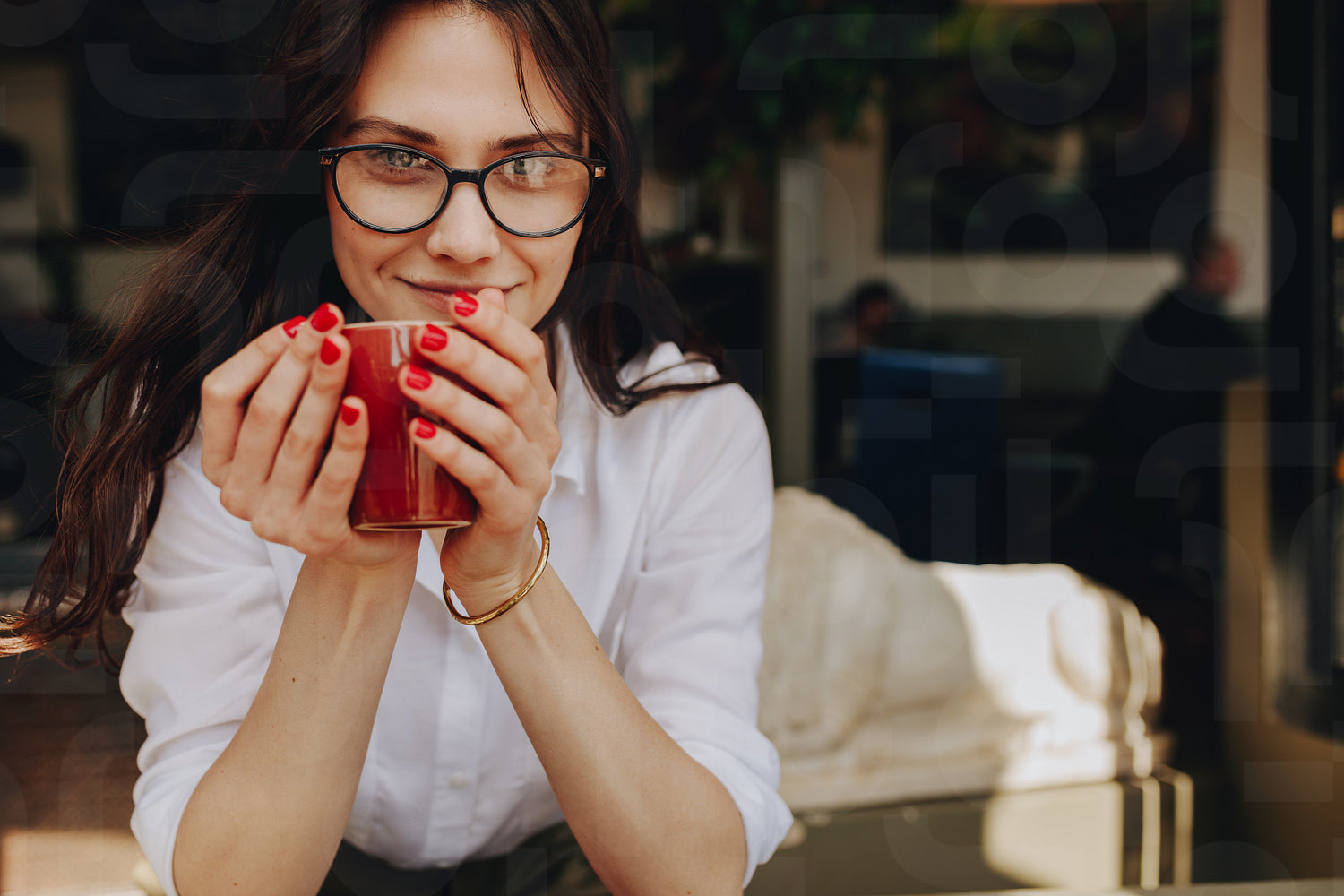 Beautiful young woman holding a cup of coffee at cafe. Businesswoman at cafe having coffee.