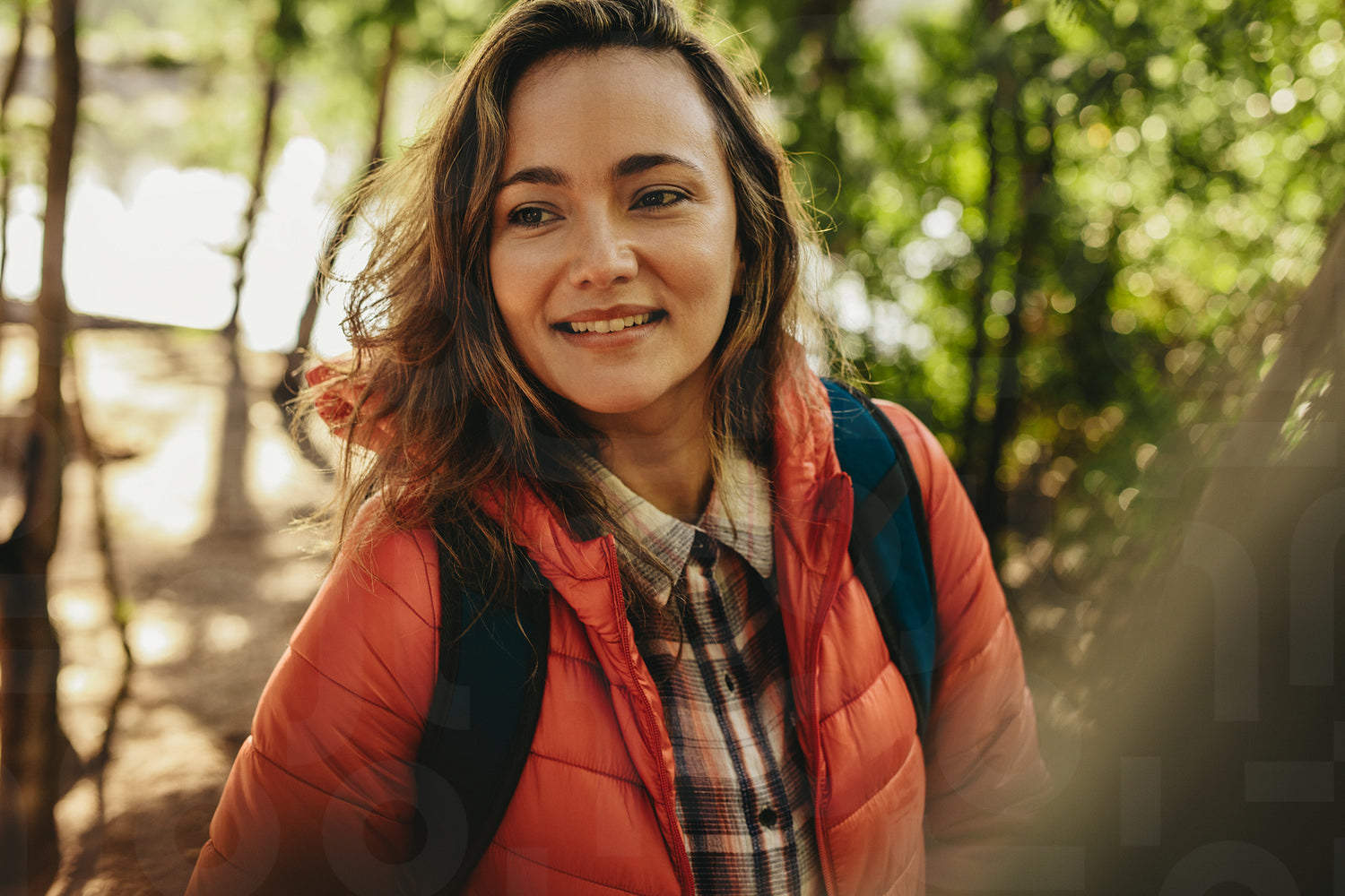 Closeup of a beautiful woman with backpack. Female camper in forest looking away.