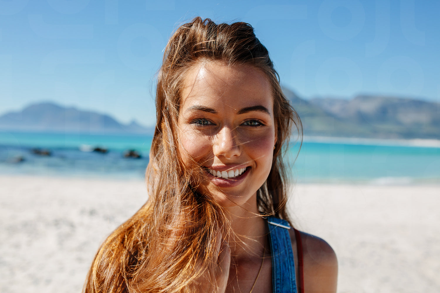 Close up portrait of beautiful young woman with fluttering hair on the beach. Young female relaxing at the beach and smiling on a sunny day.