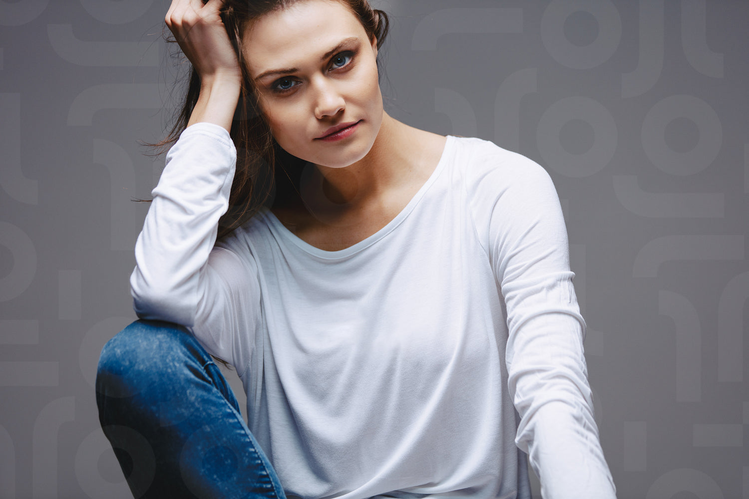 Portrait of Beautiful woman with hand on head against gray background. Female model in casuals staring at camera.