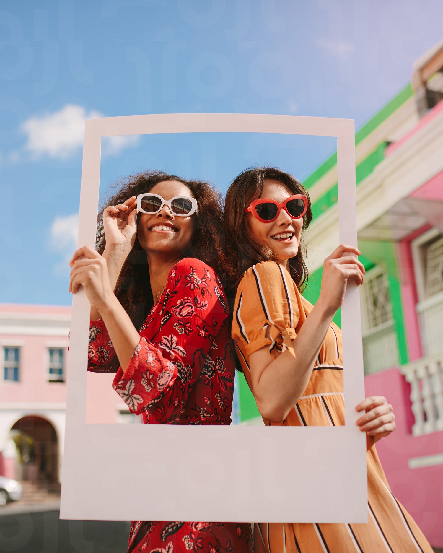 Beautiful women holding a blank photo frame in front. Attractive females with a blank picture frame looking at camera and smiling.