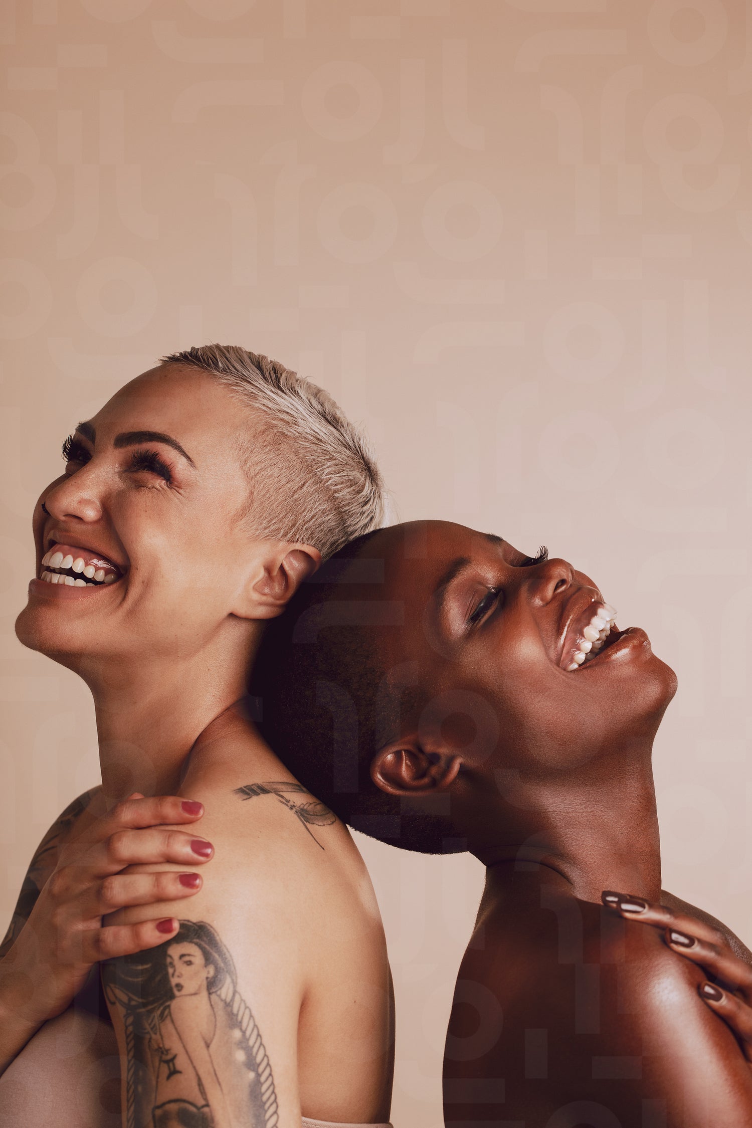 Happy diverse female models standing back to back with their head touching. Two women standing together and smiling over beige background.