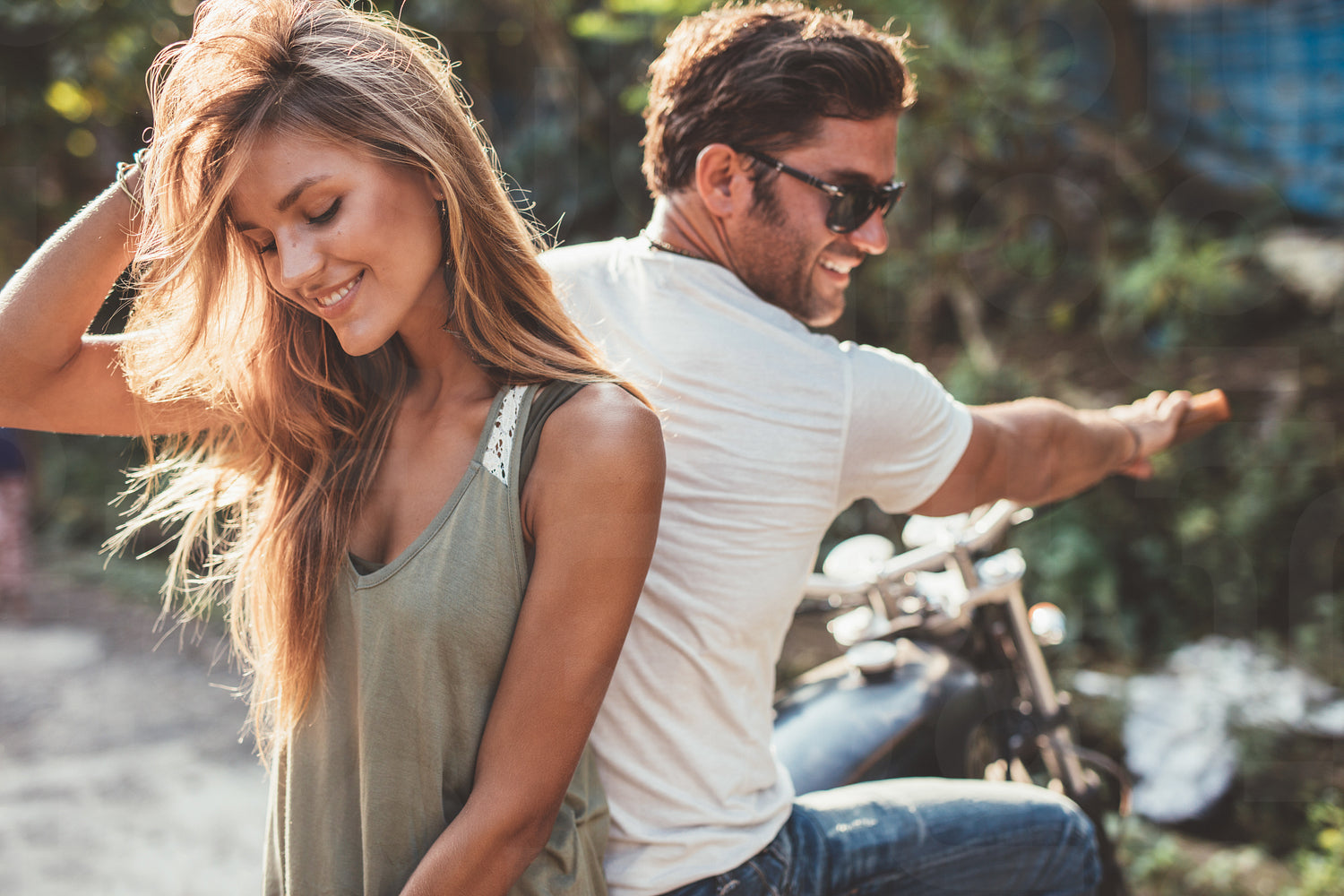 Portrait of beautiful young couple on a motorcycle. Attractive young woman with handsome young man on motorbike.
