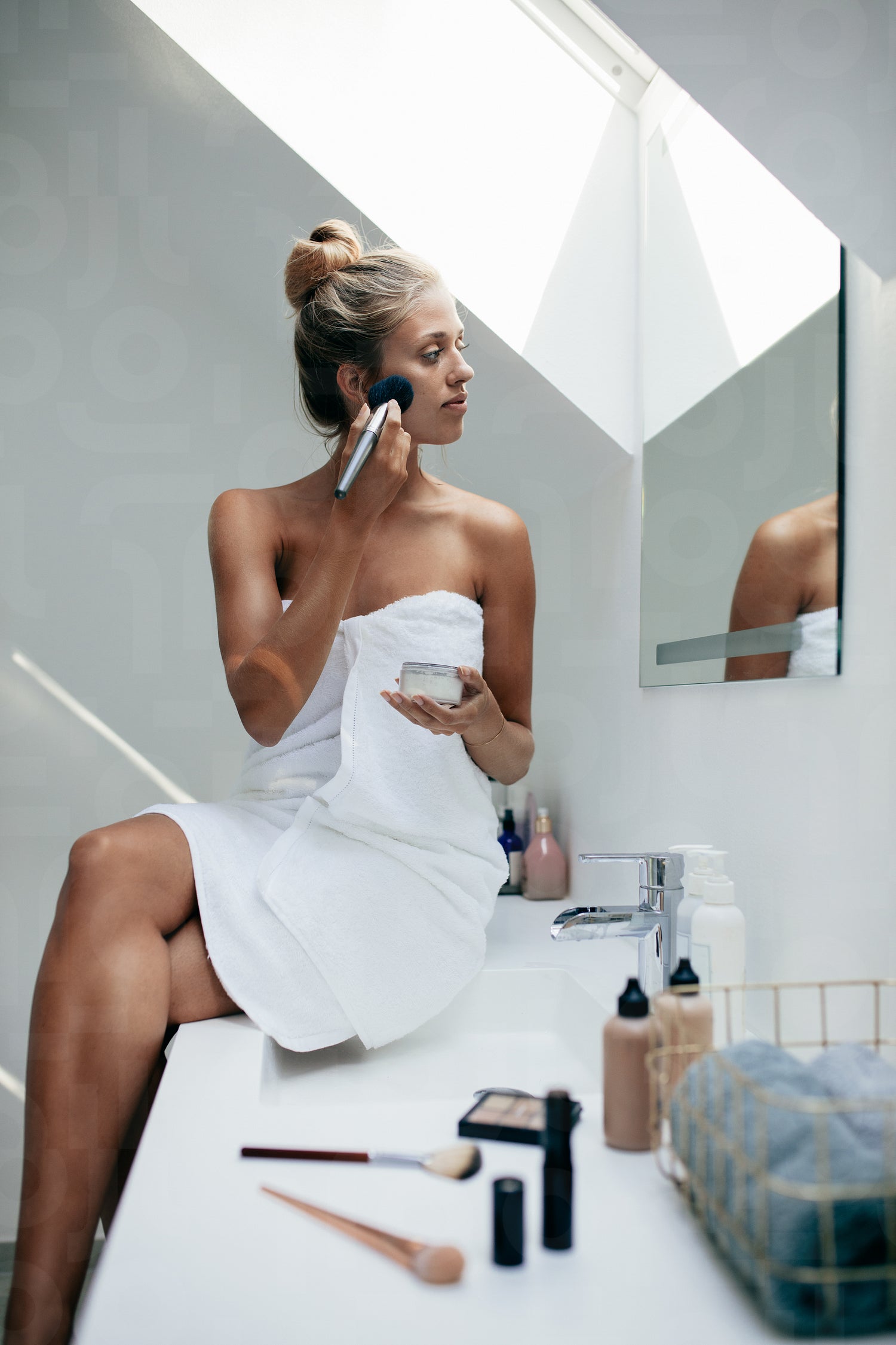 Beautiful young woman applying makeup on her face with makeup brush and looking into the mirror. Female getting ready in bathroom.