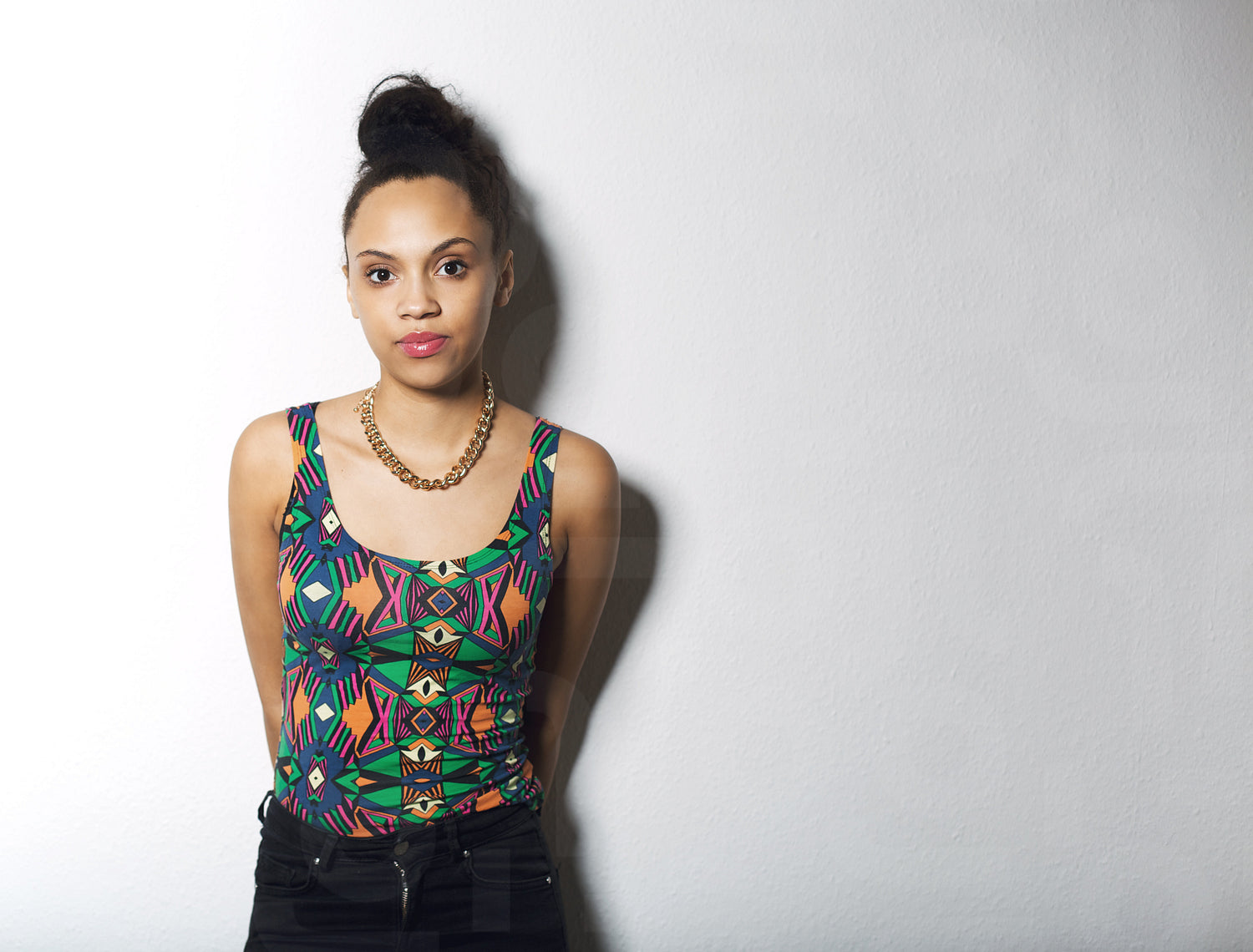Portrait of attractive young woman standing against grey background with copy space. Beautiful african female model posing in casual clothing.