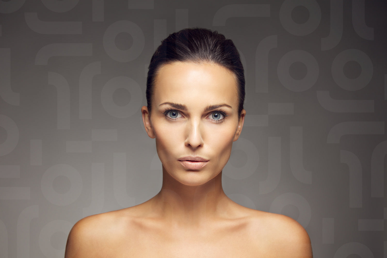 Portrait of a attractive young brunette with grey eyes looking at camera. Beautiful woman with clean and glowing skin isolated on gray background