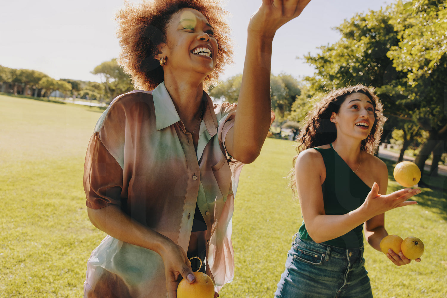 Best friends having fun juggling oranges on a sunny summer day in the park, showcasing friendship, joy, and outdoor activities.