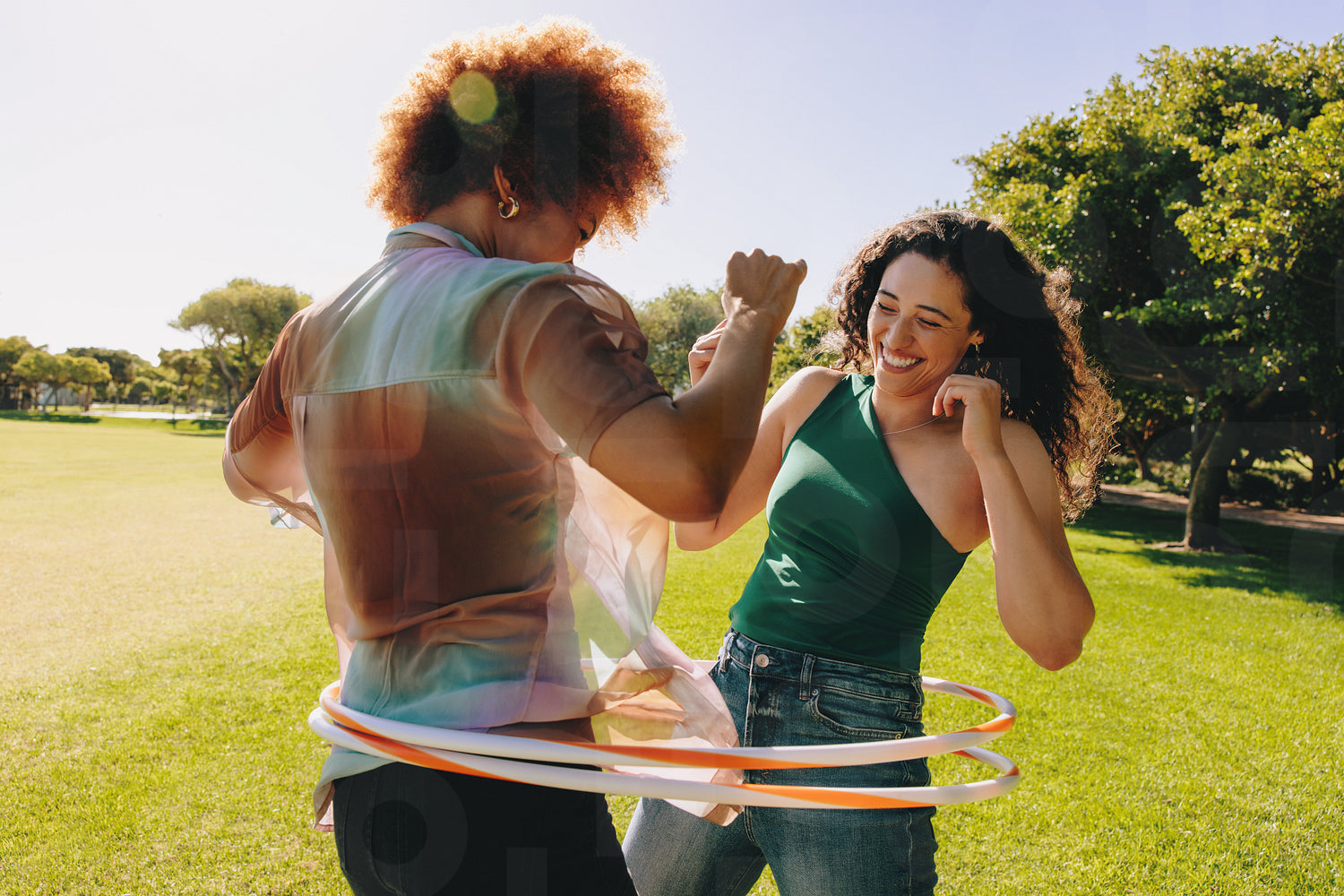 Best friends enjoying a sunny day outdoors, laughing ad having fun with hula hoops in a vibrant green space.