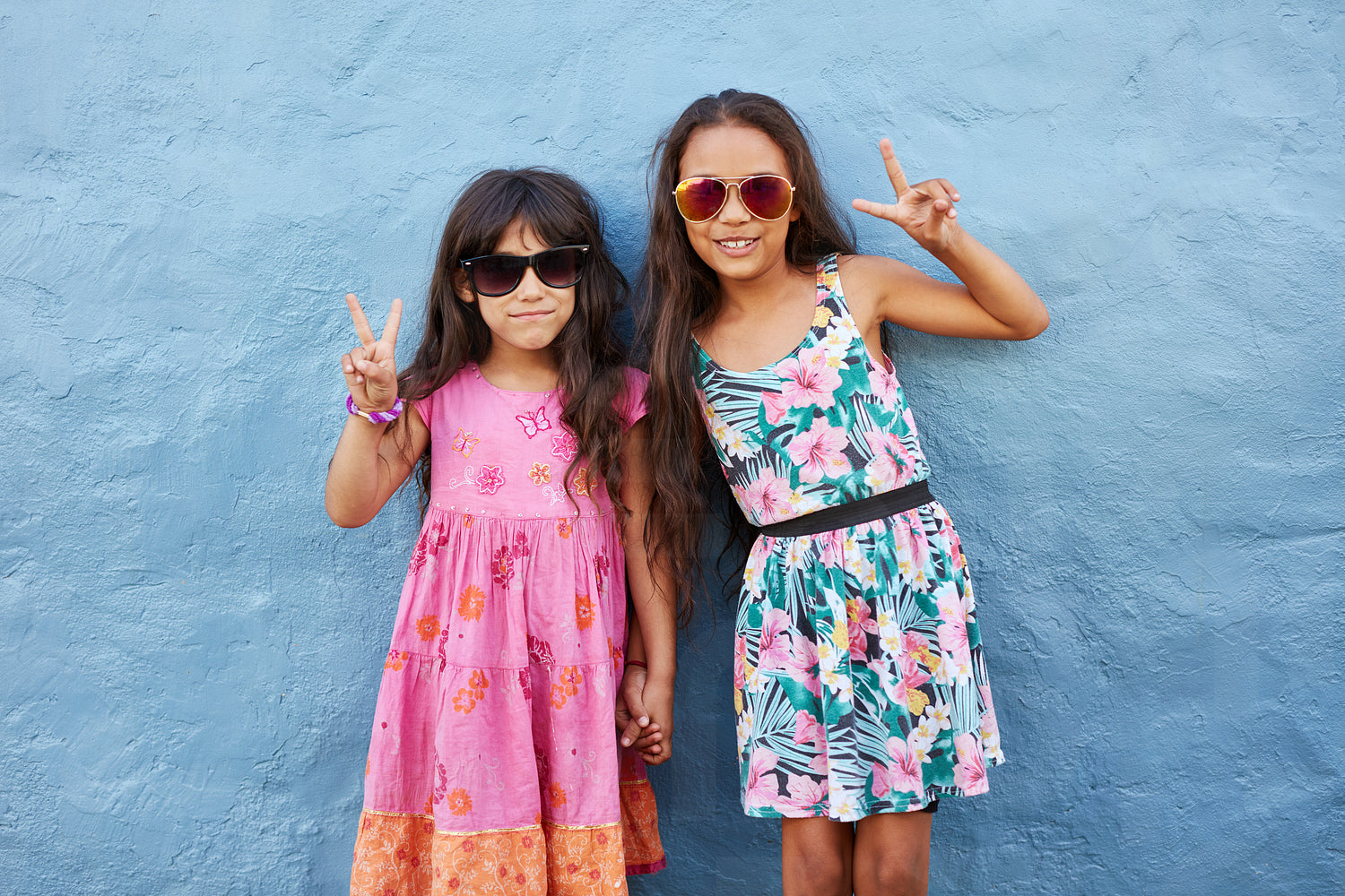 Portrait of two little girls standing together wearing sunglasses gesturing peace sign against blue wall. Stylish preteen girls posing to the camera with victory hand sign.