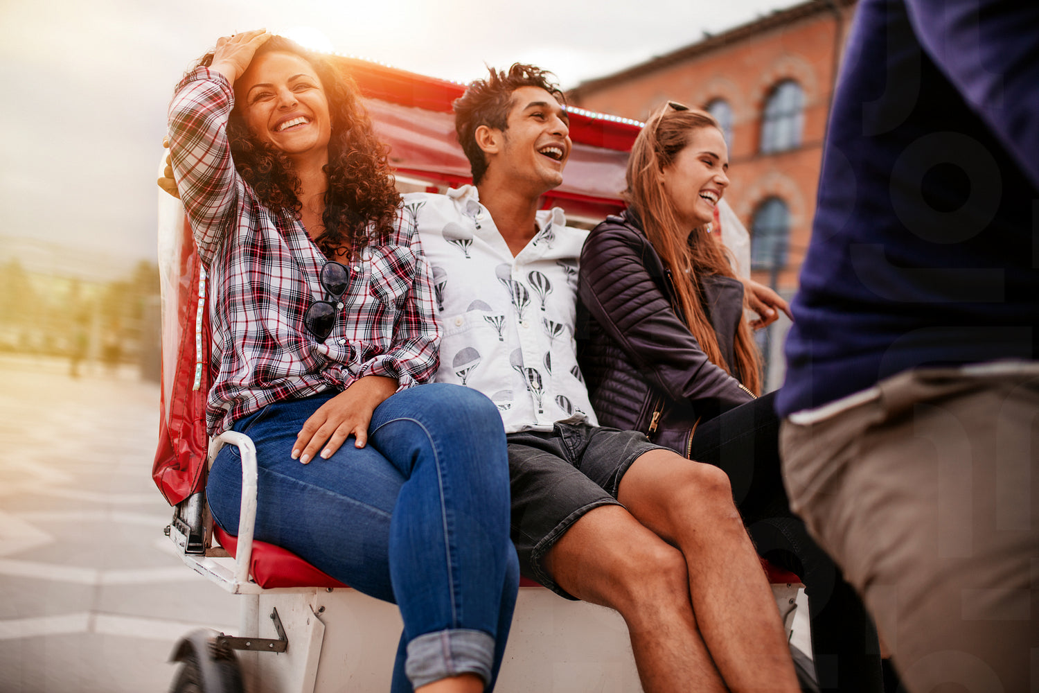 Cheerful teenage friends having fun on tricycle in the city. Young man and women riding on tricycle on road.