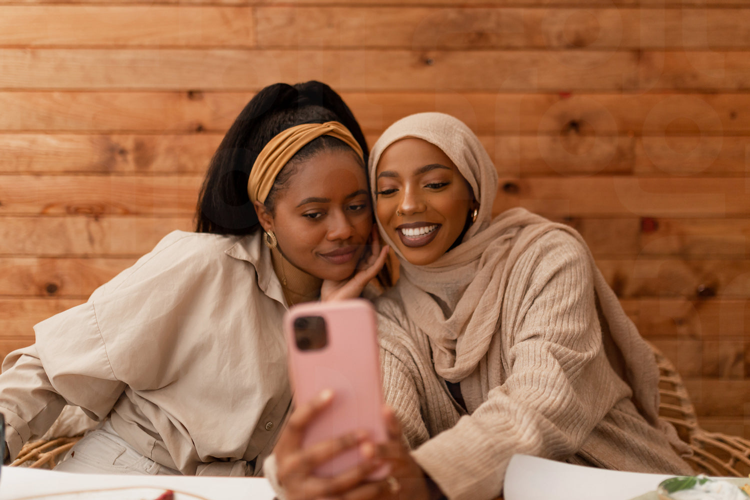 Best friends taking a selfie together in a restaurant. Two diverse female friends having lunch together in a cafeteria. Cheerful millennial friends making happy memories together.