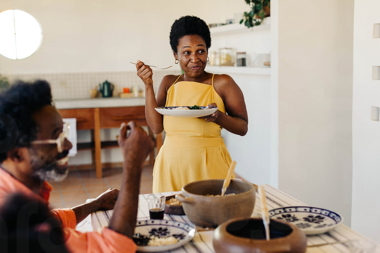 Black Brazilian family enjoying a home-cooked meal together in the kitchen
