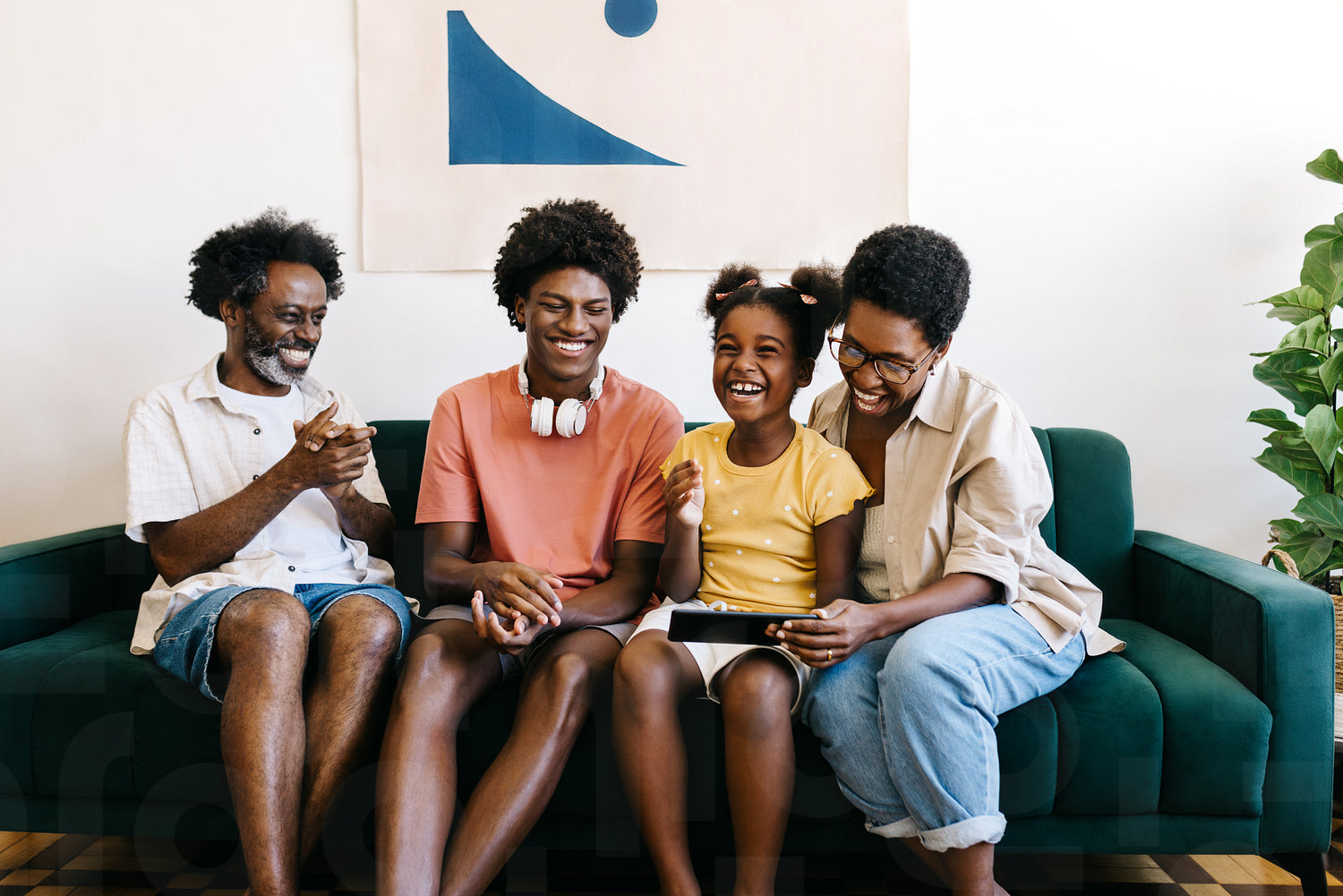 Black Brazilian family of four enjoys leisure time together at home. Parents and they two children, a daughter and a son, sit together on a couch, laughing happily while using a digital tablet.