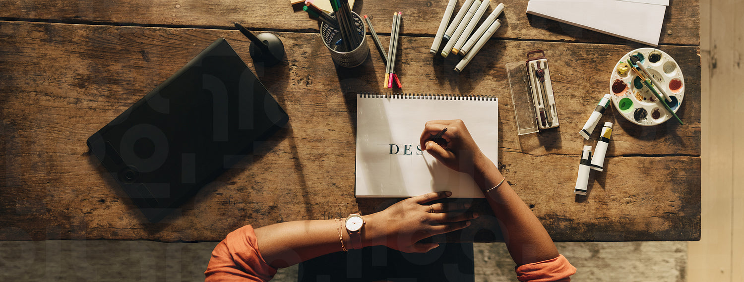 Woman drawing the word ''DESIGN'' while sitting at her creative workstation. High angle view of a female graphic designer working on a new project. Anonymous young freelancer working in her home office.