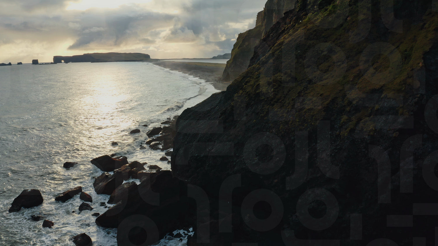Drone flight from rocky mountain to lack sand beach. Aerial shot of a Reynisfjara beach in southern part of Iceland.