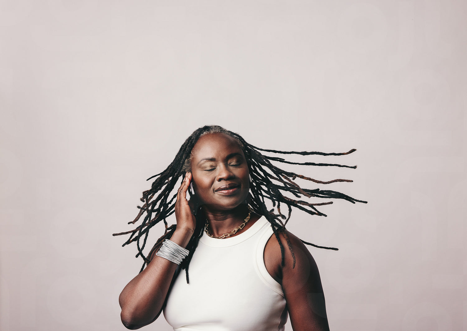 Black woman with dreadlocks listening to vibrant music on earbuds