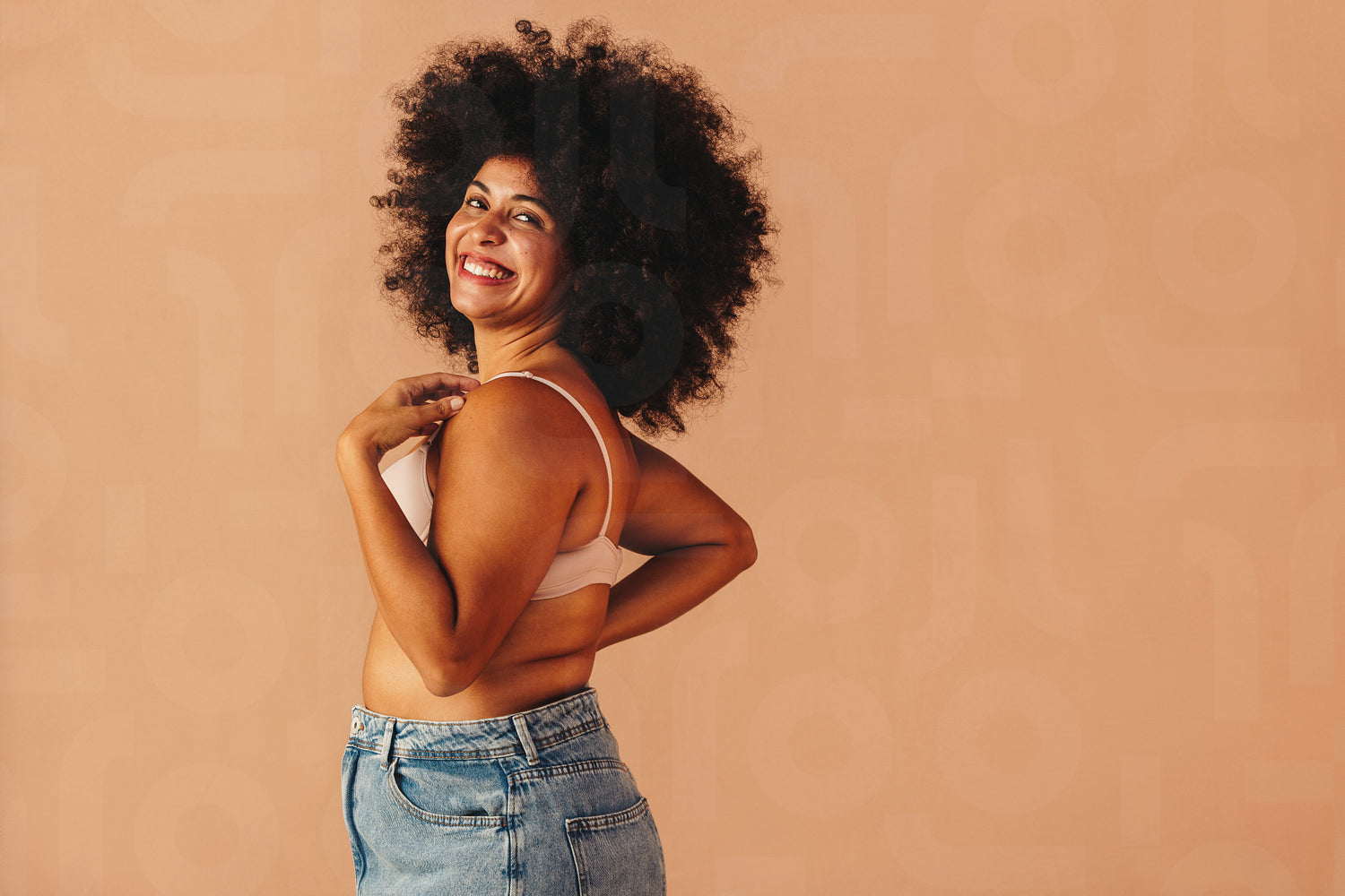 Body confident plus size woman smiling happily while wearing a bra and jeans in a studio. Beautiful young woman with Afro hair embracing her natural body and curves.