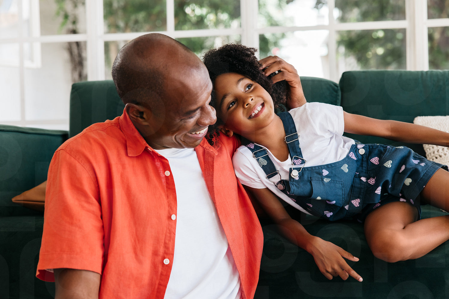 Father and his young daughter laughing and relaxing together on a green sofa in a brightly lit living room.