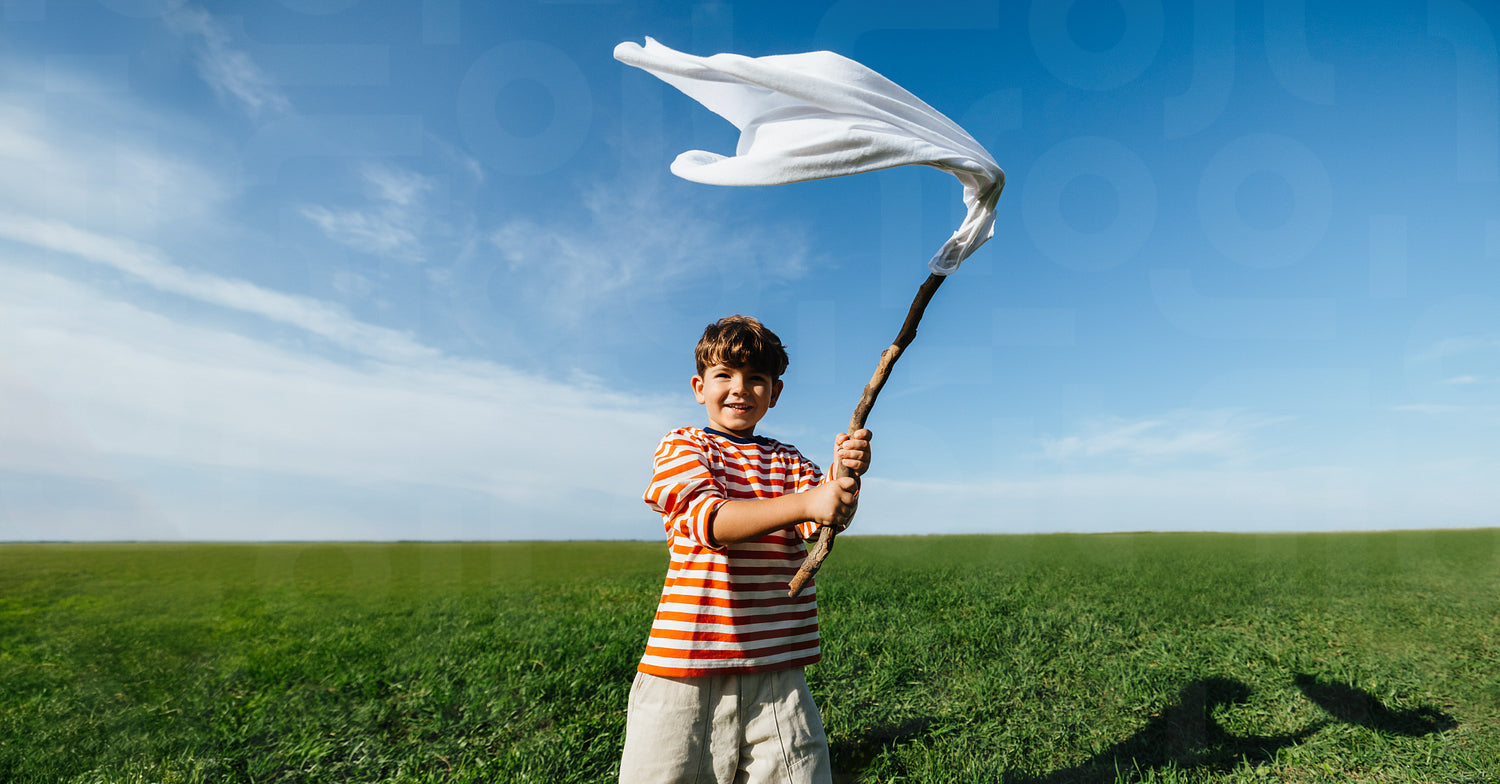 A young boy lifts a white cloth on a stick, pretending it’s a banner as it lifts in the breeze, capturing creativity and carefree childhood play in a sunny open field.