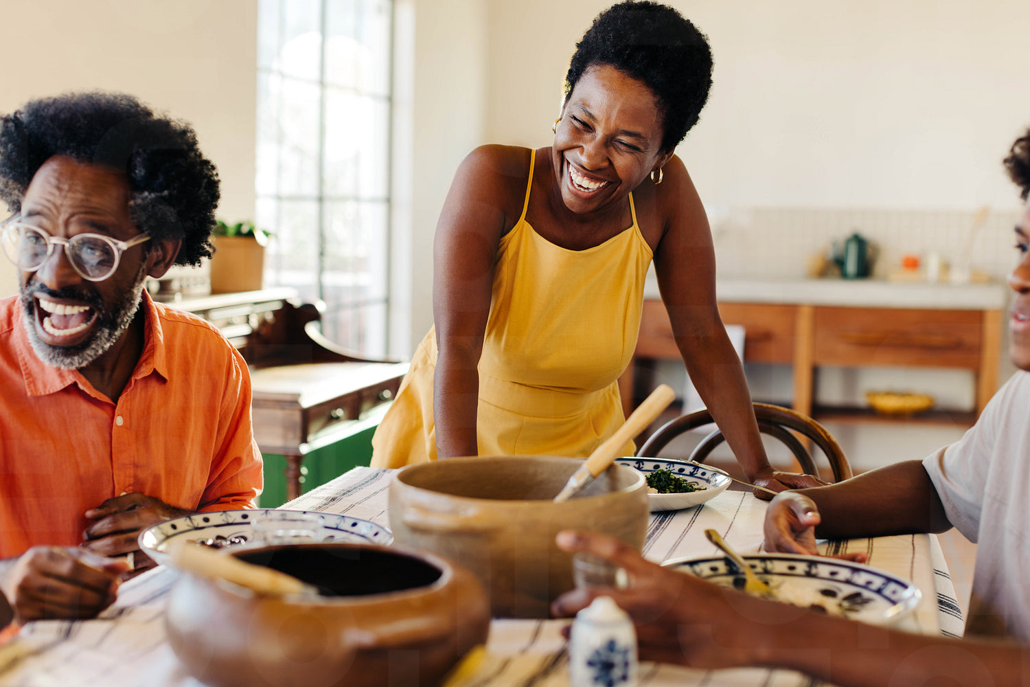 Brazilian family having a traditional feijoada meal together in home kitchen