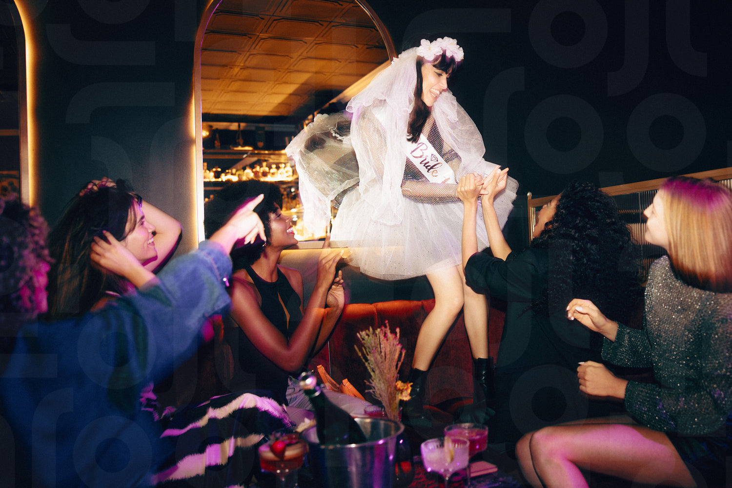 Bride and friends celebrating a lively bachelorette party at a festive venue