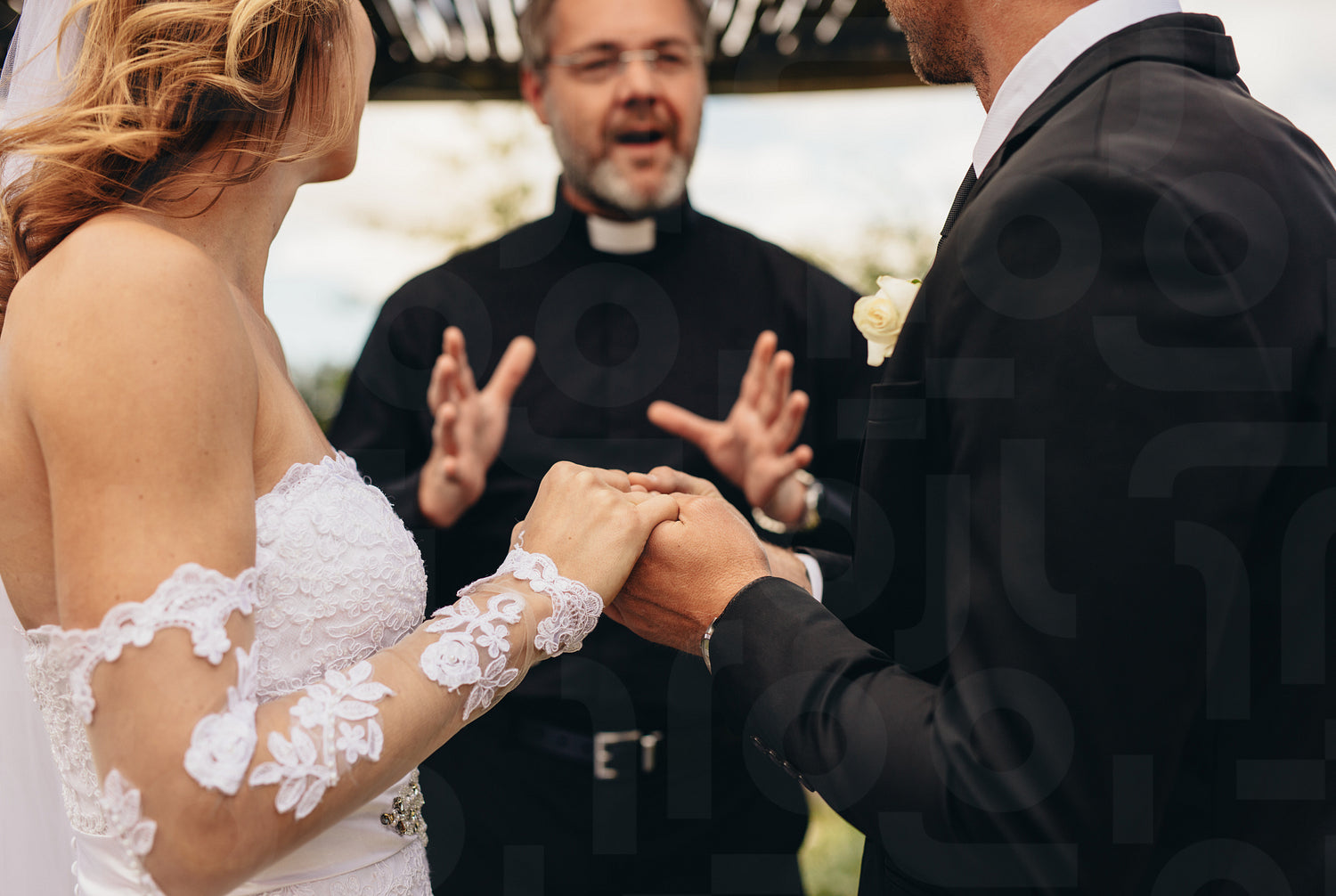 Cropped shot of couple holding hands and exchanging vows on their wedding day. Bride and groom getting married in front of a priest.