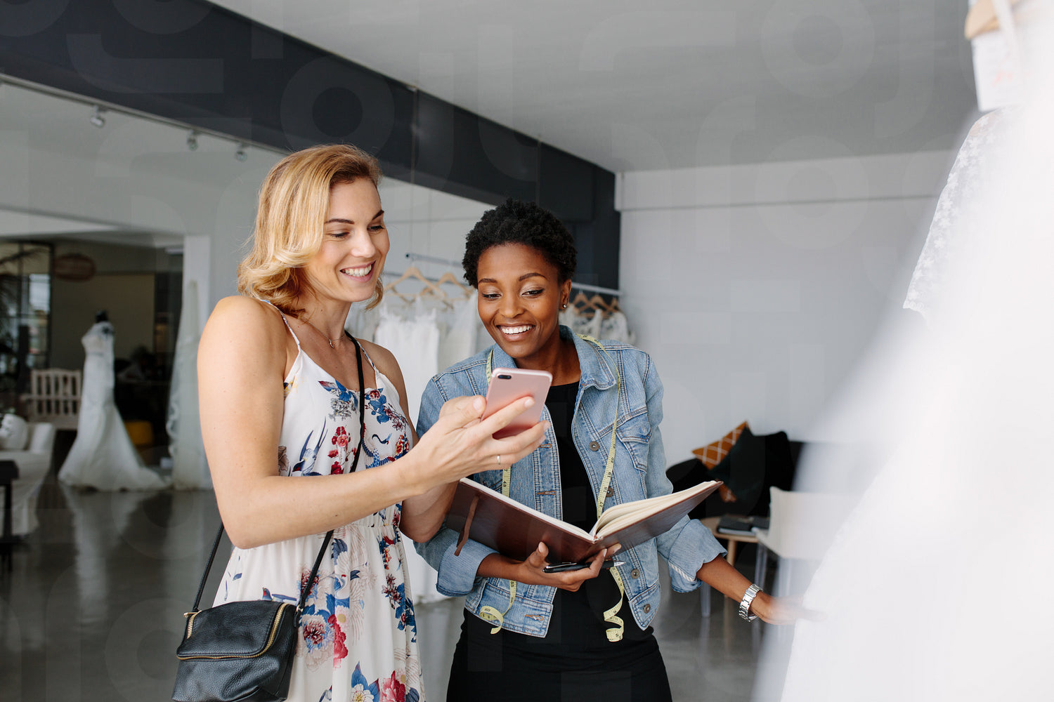 Young bride showing a wedding dress design on her mobile phone to bridal shop owner. Woman shopping for wedding outfit in bridal boutique with shop assistant.