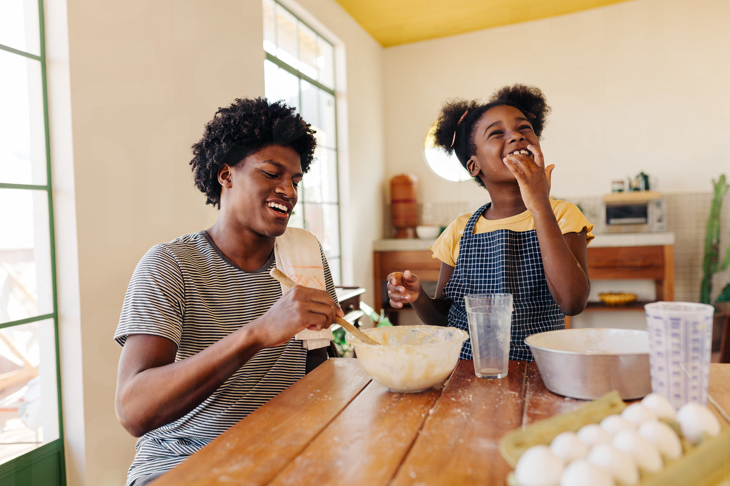 Afro-haired siblings, a teenage boy and his young sister, mix baking ingredients together at the kitchen table. Happy Brazilian children making bread with a traditional recipe at home.