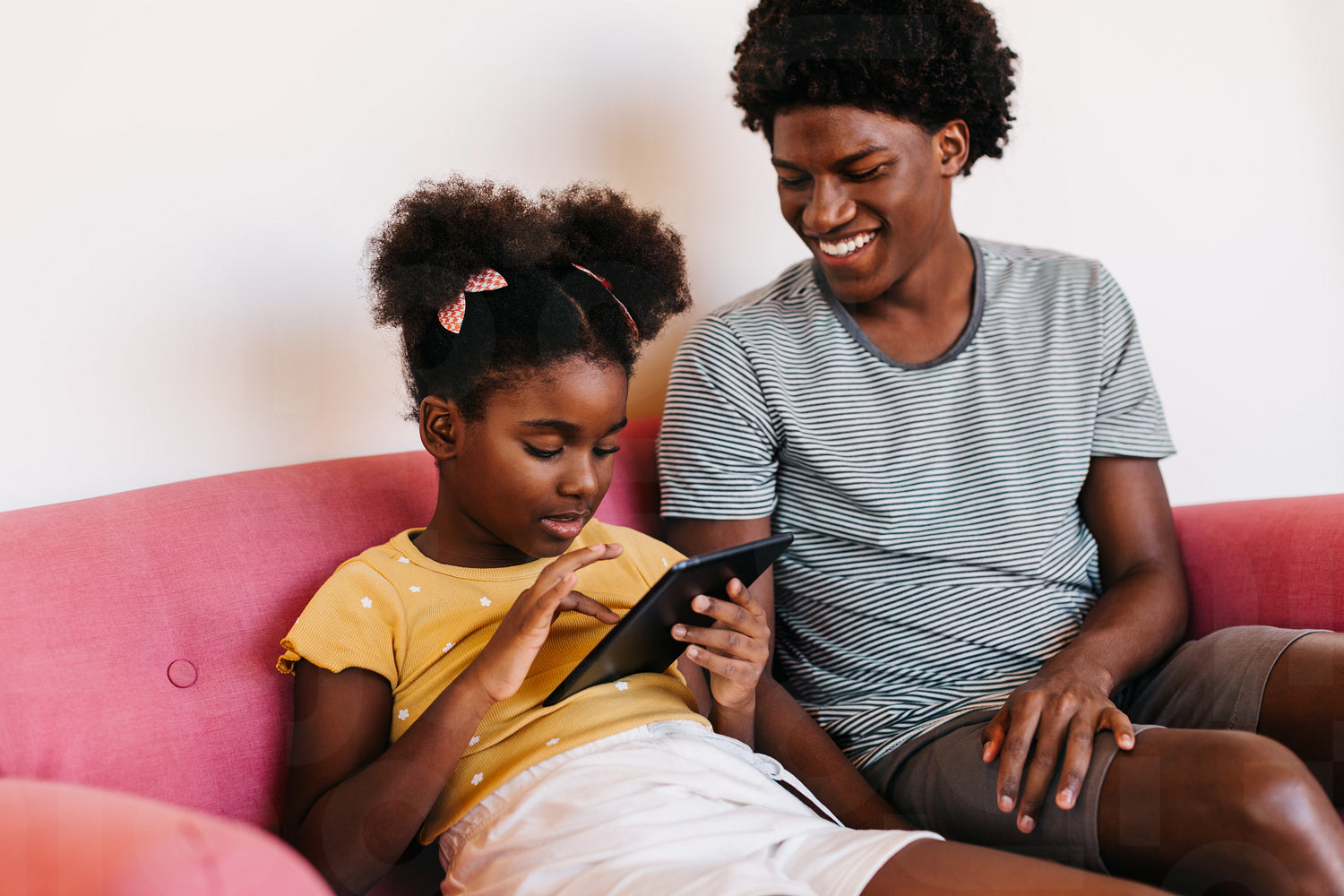 Brother and sister sharing a tablet, enjoying screen time together on the sofa