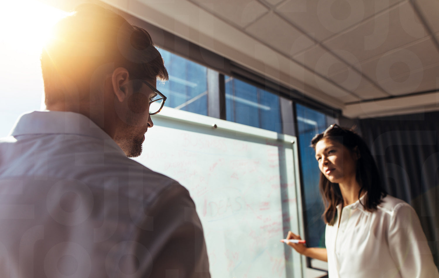 Businesswoman writing ideas on whiteboard during discussion in boardroom. Two colleagues discussing business ideas in office.