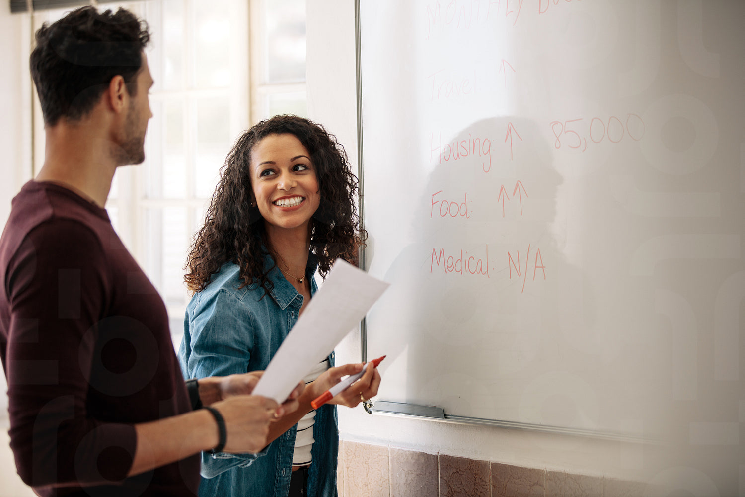 Office colleagues planning and discussing monthly budget on a whiteboard. Smiling businesswoman writing on the board while her colleague holds a paper in hand.