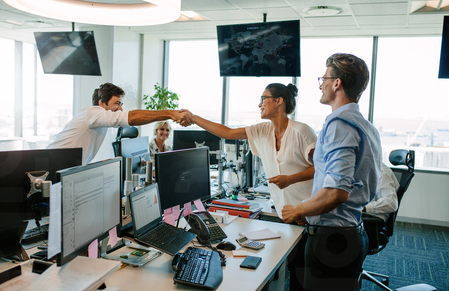 Business colleagues shaking hands in office. Happy business people celebrating success in modern office.