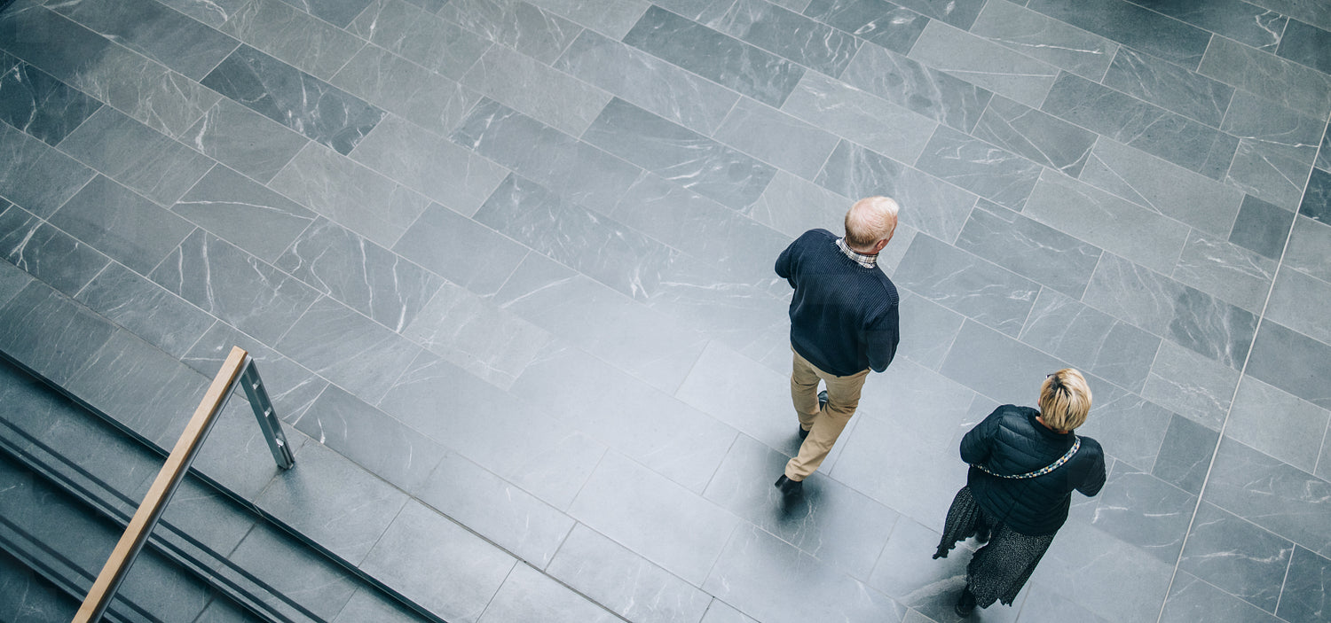 Top view of a two business colleagues walking together across office hallway. Business people arriving to work together.