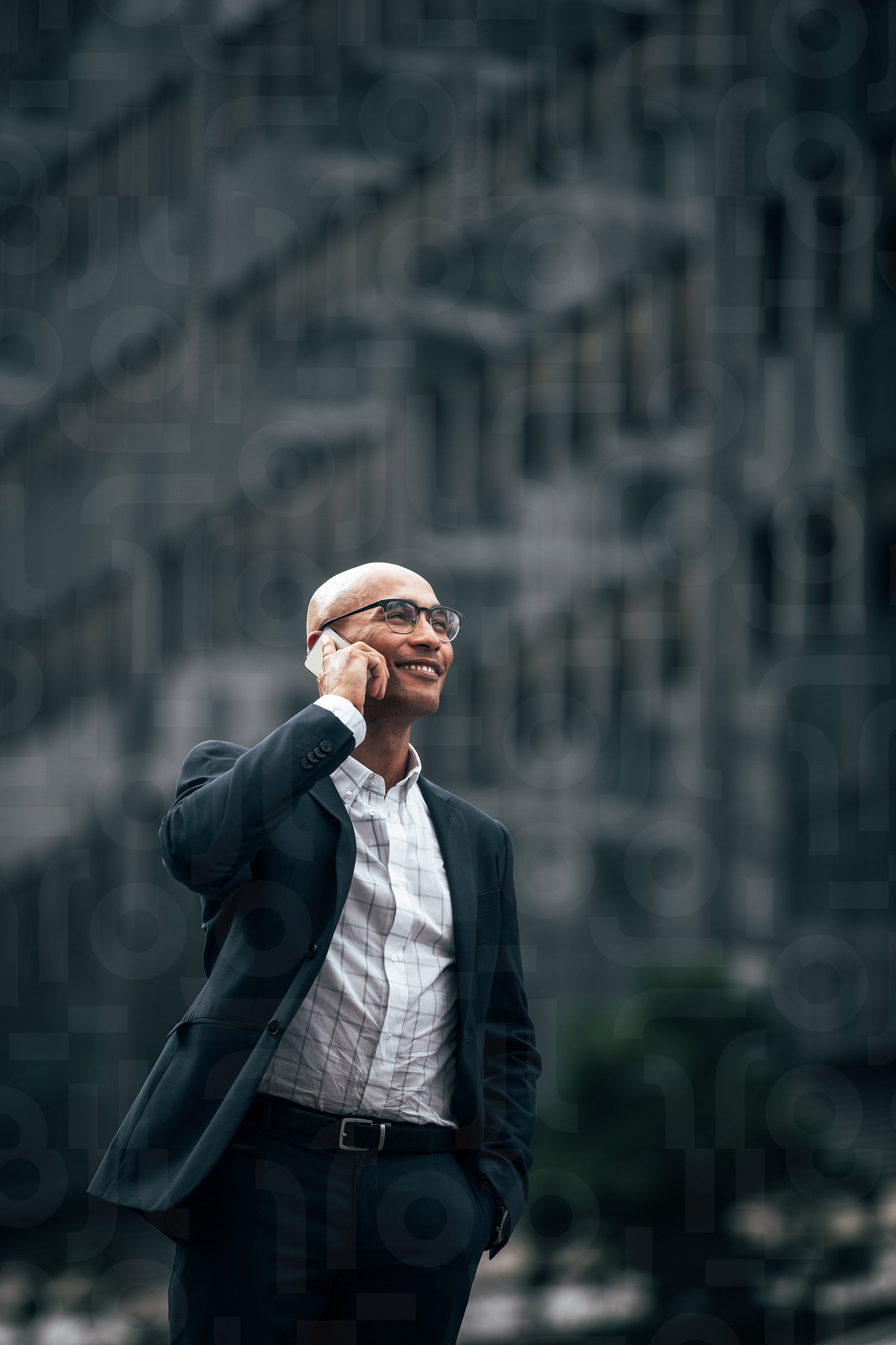 Smiling businessman talking over cell phone standing outdoors with a hand in pocket. Man in formal clothes walking on street talking on mobile phone with a blurred background.