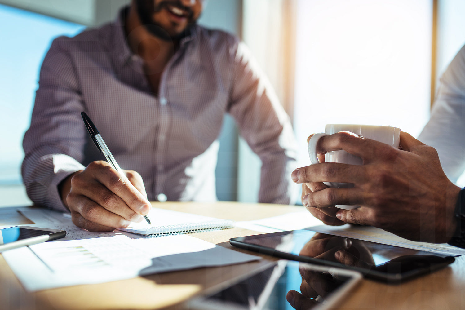 Businessman writing in notepad while his partner holds a coffee cup. Two businessmen in a discussion at office.