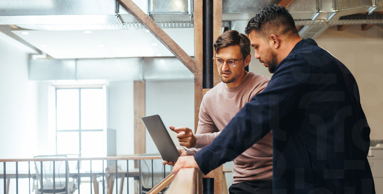 Business man discussing a tech project with his colleague in an office. Two business men using a laptop on an interior balcony. Male professionals working together.