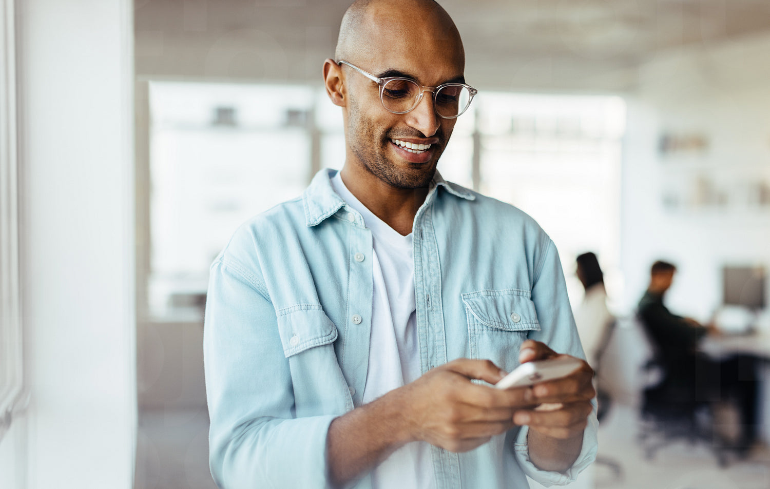 Business man typing on a mobile phone in an office. Happy young business man sending a text while standing in his workplace.
