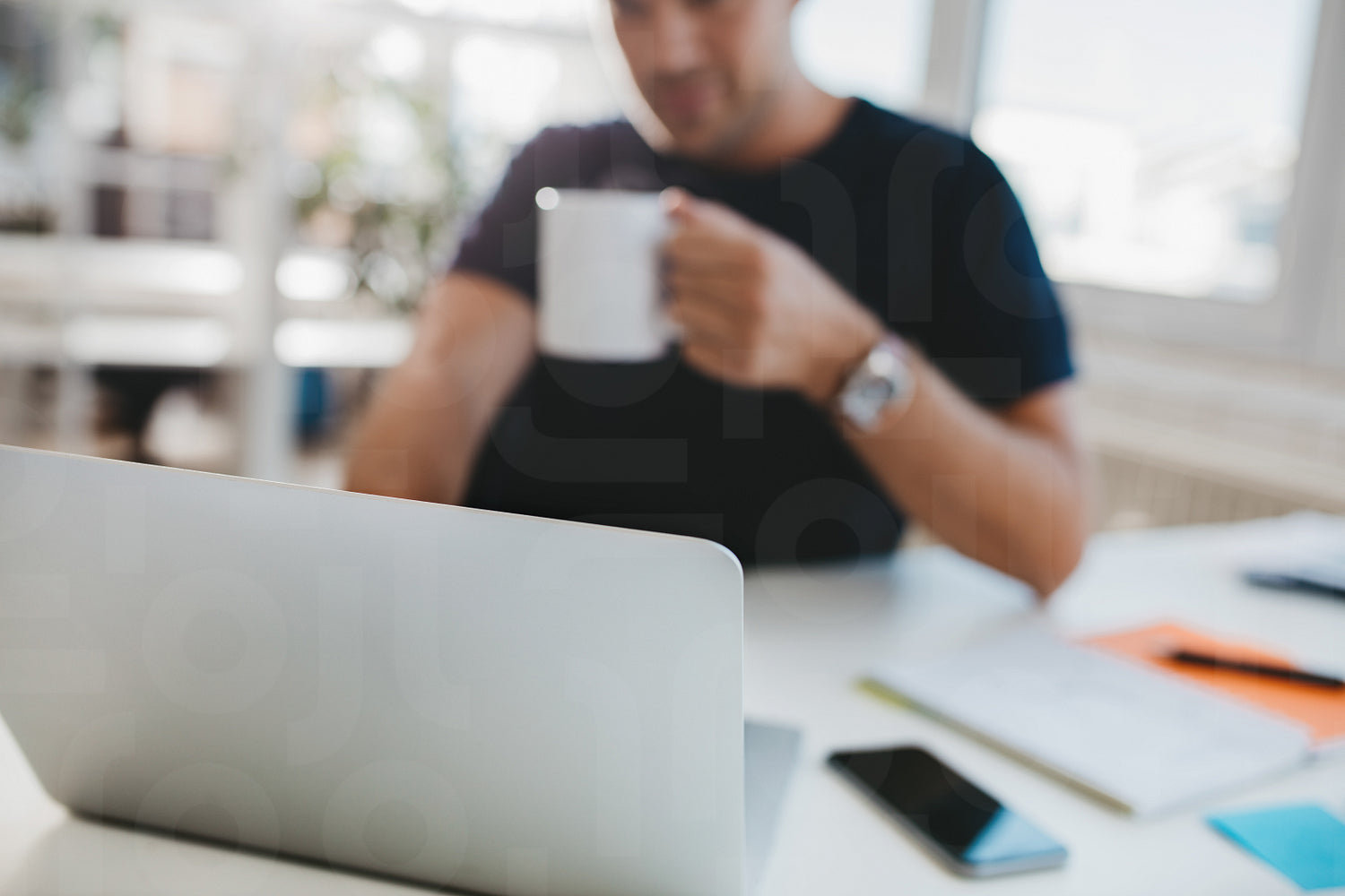 Laptop on office table with man sitting by and drinking coffee. Business man work desk with focus on laptop.