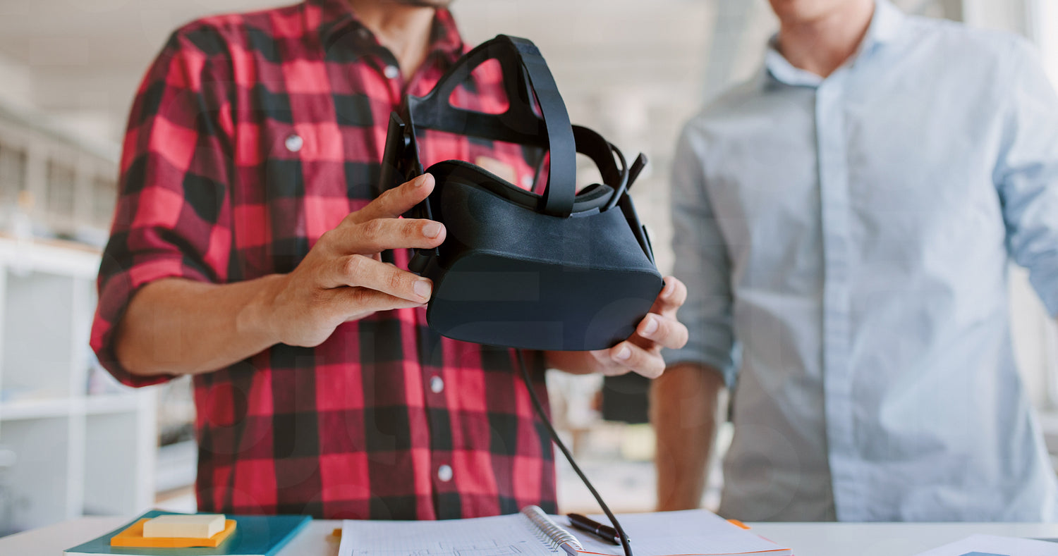 Cropped shot of two young men testing virtual reality headset in office. Business men working at desk holding VR glasses.
