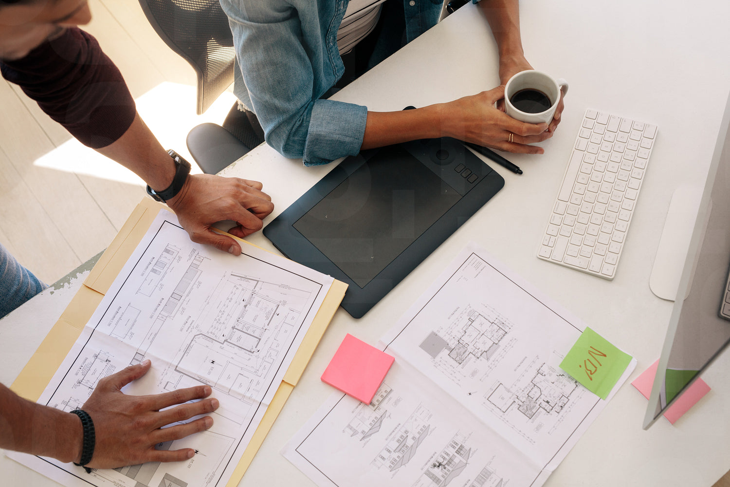 Top view of two business colleagues looking at architecture plans sitting in front of a computer. Man standing at the desk with a plan while his female partner is sitting with a coffee cup.